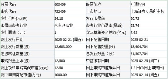 汇通控股于2025年2月20日披露的首次公开发行股票并在主板上市发行公告显示,公司本次募投项目预计使用募集资金金额为81,025.98万元。按本次发行价格24.18元/股和3,150.7704万股的新股发行数量计算,若本次发行成功,预计公司募集资金总额为76,185.63万元,扣除发行费用约8,329.59万元(不含增值税、含印花税)后,预计募集资金净额约为67,856.04万元(如有尾数差异,为四舍五入所致)。